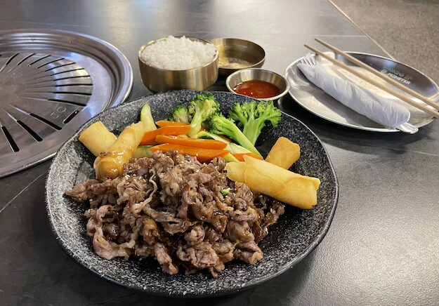 During the construction the place was wrapped as tightly as a Christmas present under the tree. The location was previously a mattress store and I have been anxiously waiting to see the makeover. The décor could best be described as modern sleek Asian. I was especially curious to see how they would accommodate barbeque pits in a former mattress store. The black table topped pits with sleek chrome plated exhaust pipes make for a surprisingly warm and inviting atmosphere. They built an earth-toned, brick wall in the center of the room and covered it with TV screens playing Korean K-pop videos, giving the room a hip Gangnam vibe. As an added delight they have a whimsical robotic waiter that delivers the food right to your table. As anyone who has visited East Asia can tell you, the heavy reliance on the latest technology makes the atmosphere authentically Asian.