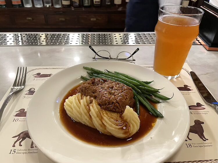 At the opening, they made a great deal about having brought back the old pub’s “pub chips.” That is fine, but I expect much more than ordinary pub food from Daniel Pochron, and I am happy to say that my expectations were more than met. I like to see how good chefs reinterpret traditional dishes, so I ordered the meatloaf with haricots verts and mashed potatoes. In my view, the mark of a good chef is someone who can take an ordinary dish, and make it memorable.