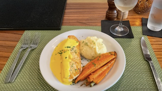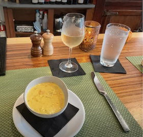 I ordered the specials. A saffron crab and scallop soup to start and the halibut with a white wine, citrus, and saffron reduction sauce with mashed potatoes and carrots. I give both my highest accolade, they were memorable. The halibut was cooked to perfection and the sauce was delicate, tart, and savory.