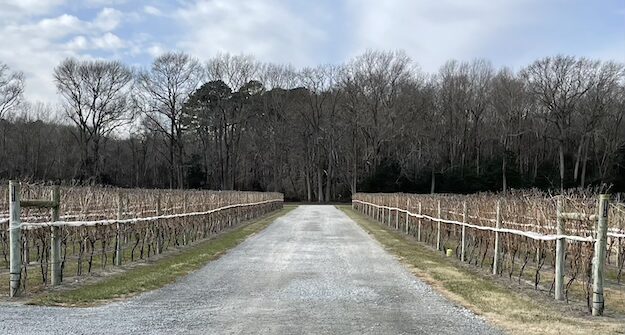 The gravel driveway takes you through the center of their front vineyard. You can tell by the size of the vines that this vineyard is young, planted less than ten years ago. At the end of the driveway, stands the tasting room. Behind they tasting room is another more extensive vineyard that stretches to a majestic stand of trees. In my view, there is nothing prettier than a vineyard in winter, and this vineyard has a quiet peaceful beauty. The gravel driveway, flat landscape, and distant trees put me in mind of the vineyards in the Coonawarra. I walked past the tasting room and into the back vineyard, planted with vermentino grapes. I stopped for a moment to take in the stark beauty of the dormant vineyard.