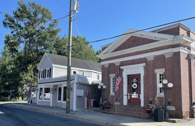 The fields end abruptly at White Marsh Elementary School where you turn, right on Main Street to head toward the center of town.  A short distance down Main Street you come to a four-way stop and you are suddenly in the heart of Trappe. On this corner you will find Momma Maria’s, in my view, one of the best restaurants on the Eastern Shore. Across the street is a brick Revival bank building that now houses Coffee Trappe. Driving past Coffee Trappe down Main Street, you enter the historic center of Trappe. Trappe is small, the entire town runs along Main Street for less than a mile.