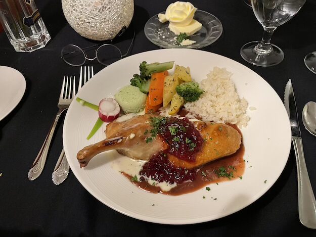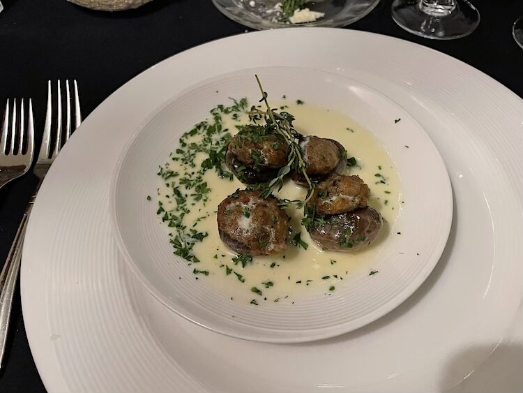 I was in Seaford in the late afternoon on a cold winter’s day. The prospect of the cozy atmosphere and French cuisine seemed the perfect antidote for my frozen fingers and toes. It was early for dinner, so Karen handed me a menu and sat me at a table in the front window. The waitress came by to tell me the specials, but I had already made up my mind, the Spicy Sausage Stuffed Mushrooms appetizer and Roast Duck in creamy lingonberry sauce for the main. I asked the waitress for a recommendation on a wine to accompany the duck and she brought two wines to the table for me to sample, from which I chose the cabernet sauvignon. The waitress returned with the wine and warm bread and a beautiful, almost too pretty to eat, rosette of butter.