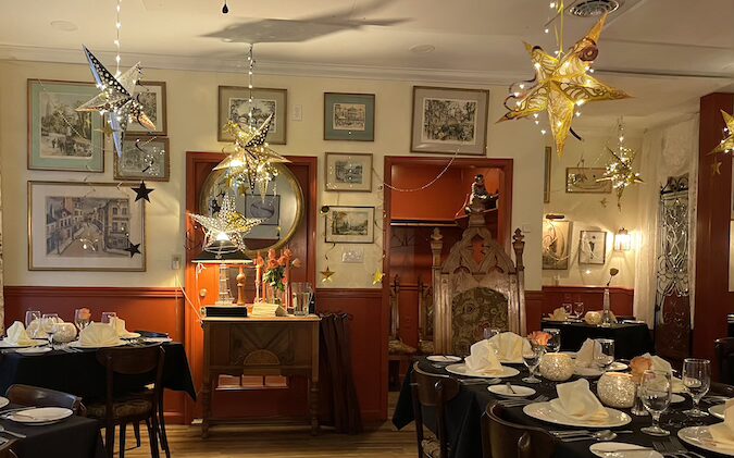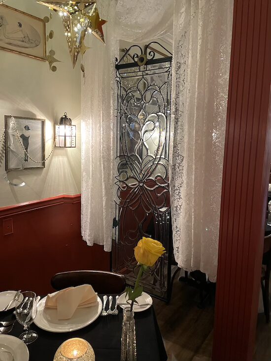 I have been to this restaurant several times over the years. The first time I walked in, I fell in love with its cozy, slightly upscale Parisian bistro vibe. In fact, the dining room reminds of a bistro I used to frequent on the Quai d’Orsay in Paris. The walls are covered in posters and gold framed mirrors, the black tablecloths and white linens give it a sophisticated feel, while the star shaped chandeliers add an approachable whimsy to the room.