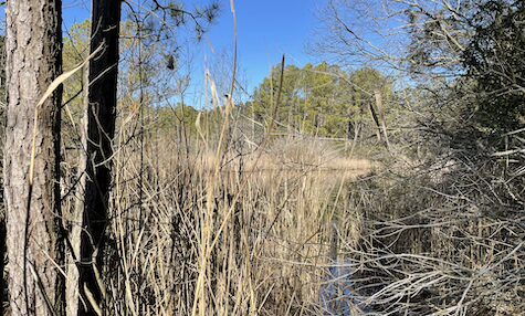 The park trail starts at the entrance of the parking lot. You first walk through an open field and then the trail enters the forest and follows a small stream to a field of marsh reeds. Somewhere beyond the reeds is an inlet of Isle of Wight Bay, but you can only get a glimpse of it from the end of the trails. It is obvious that some people have cut a trail through the reeds, but the park has multiple signs asking people to remain on designated trails. The point being that this park was designed to be a nature park with minimal human impact.