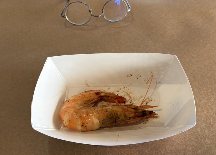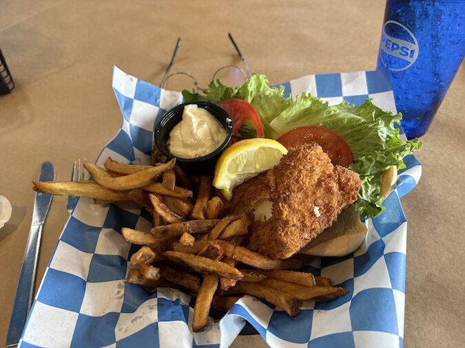 The tourist season is about to start, so I decided I better get over to Shrimp Boat before the crowds returned. Even though it was still before noon and off season, the restaurant was already nearly full when I arrived. I already knew what I wanted so as soon as I sat down, I ordered the flounder sandwich. The waitress soon returned with ta drink and a complimentary steamed shrimp with the head-on. From the start, Joe Crocetti has been on a mission to promote this method of cooking shrimp, so every guest gets a sample shrimp.